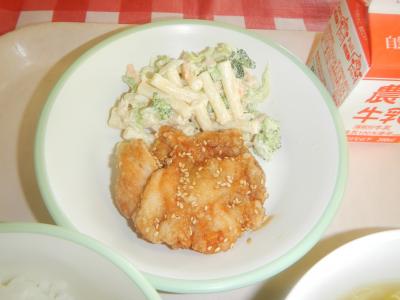7/10 ごはん、牛乳、鶏肉のごまからめ、マカロニサラダ、キャベツのみそ汁