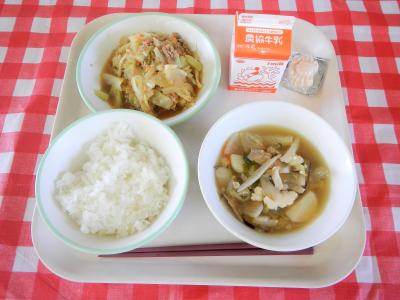 2023/5/26 小松菜豚丼、牛乳、あっさり漬け、もやしのみそ汁