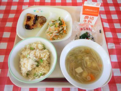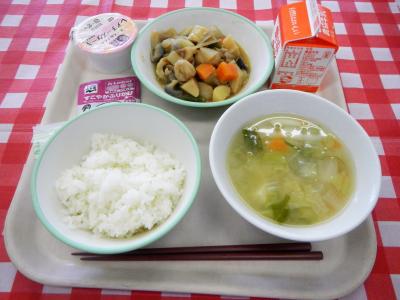 今日の主食は「茶飯」です。しょうゆで色のつけたご飯も地域によっては「茶飯」と呼ぶそうで、給食献立にしました。だし昆布をいれて炊いているので、給食室にだしのいい香りが充満していました。