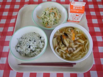 わかめごはん、牛乳、五目うどん、バンバンジー