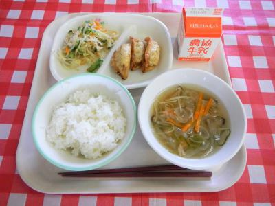 5/1(月)ごはん、揚げぎょうざ、もやしのピリ辛ナムル、大根の中華スープ