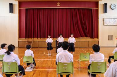 10月4日(水)後期生徒会の認証式と生徒集会が行われました。執行委員のマニュフェストを踏まえながら、会長、副会長、執行委員の3名がしっかりと挨拶を行いました。校長先生からは、任命書の重さと投票をした全校生徒で協力して、よりよい三崎中を目指して取り組んでほしいというお話がありました。その後、生徒集会では、各委員会からの取組計画が発表され、質問と答弁が交わされました。一人一人が参画意識をもって生徒会を動かしていけるように、ぜひ、今日の集会での話し合いを生かしていってほしいと思います。