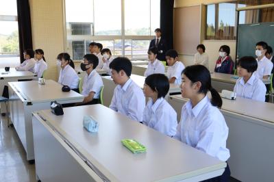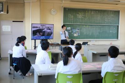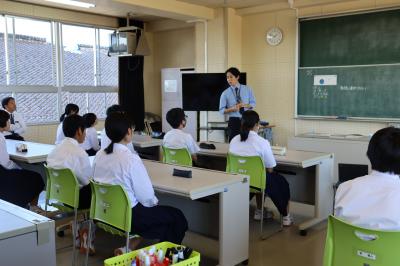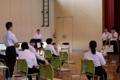 7月10日(月)、2年生を対象として、ジョブカフェ石川キャリア教育出前講座を実施しました。2年生は、夏休み中にわくワークとして職場体験学習があります。事業所様のご協力を得て職場体験をさせていただきますが、マナーや仕事への姿勢を学ぶ貴重な体験です。そこで、実際に事業所様にお世話になる前に基本的なマナーや姿勢を学ぶ機会として、この出前講座を設定しました。講座では、講師の森田様よりマナーの大切さを教えていただくとともに、挨拶の演習もしていただき、職場体験前の心構えをつくるよい機会となりました。ありがとうございました。