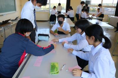 10月12日(木)6限,全校道徳の授業の後,全校学活を行いました。全校道徳の授業を受けて,ある高校生のスマートホンの1日の使い方を映像で見た後,気づいたことを発表し合い,デジタル機器を使いながら自分の学習生活に影響を及ぼさないように使うにはどのようなルールをつくればよいかを,1年生から3年生までが混じったグループでホワイトボードを使いながら熟議を行いました。各班からは,就寝の30分前には,スマホの画面を消し,クラシック音楽を聴きながら寝るとよいなどの実践的な意見が多く出されていました。自分たちでルールを話し合い,実践していくことが大切です。ぜひ,みなさん,自分のデジタルライフを改善できるように取り組んでいきましょう。