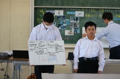9月21日(木)後期生徒会役員選挙及び立会演説会がありました。後期生徒会に立候補した3名が、それぞれ、マニュフェストを基に、演説を行いました。会長立候補者のマニュフェストは「学校のルールを見直します。」、副会長立候補者は「目安箱の設置で、みんなが過ごしやすい学校を目指します」、委員立候補者は「少人数の良さを生かせる学校を目指します」と自分の思いをしっかりと演説で伝えることができました。その後、投開票が行われ、3名全員が信任投票により当選しました。おめでとうございます。マニュフェストを実現できるように、後期もぜひ、がんばってほしいと思います。