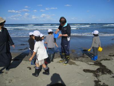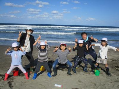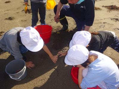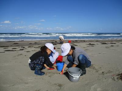 10月11日(水)小中連携の活動として,みさき小学校の1年生5名と三崎中学校の下の砂浜でスナガニとりを行いました。講師は中学校の校長先生にお願いしました。天気にも恵まれ,砂浜に出てみると,たくさんの穴があいていて,スナガニがいる形跡があります。さっそく,白い乾いた砂を穴に入れて,ほっていきますが,なかなか見つかりません。たくさん穴はありますが,本当にスナガニがいる穴には,掘り出した砂が小山のようになっていたり,食事をした砂団子があったりするのですが,なかなかそのような穴が見つかりません。それでも,しばらくすると,1匹,豆粒ほどの小さなスナガニを見つけて,1年生の子どもたちと観察ができました。結局。3匹のスナガニを見つけて,観察した後,スナガニを砂浜に返して,スナガニと遊ぼうの活動を終了しました。とても楽しい活動でした。1年生のみなさん,ありがとうございました。