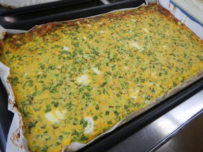 11/11 チーズの日 ごはん、スパニッシュオムレツ、野菜とチーズのサラダ、根菜クリームスープ