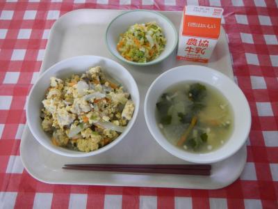 そぼろ丼には大豆たんぱく、すまし汁には木綿豆腐、豆乳ブランマンジェと、豆腐づくしです。