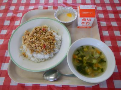 2024/10/2 そぼろ丼、牛乳、あっさりづけ、すまし汁、豆乳ブランマンジェ