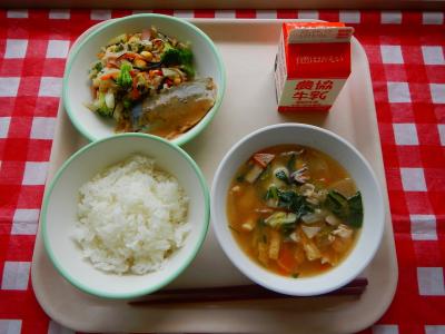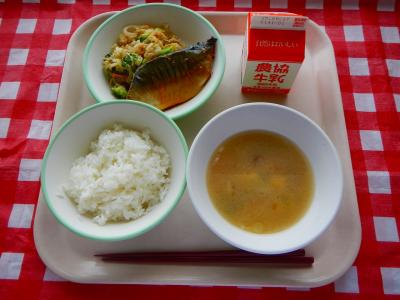 9/11 ご飯、牛乳、さばのかば焼き風、もやしのごま和え、なめこのみそ汁