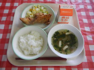 2025/6/24 ご飯、牛乳、フライドチキン風、チーズコーンポテト、コンソメスープ