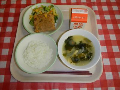 2025/7/1 ご飯、牛乳、鶏肉のごまからめ、ドレッシングサラダ、わかめのみそ汁
