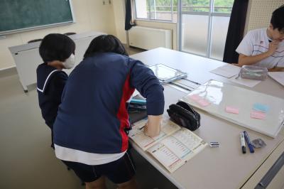 3月15日(水)いよいよ中間テストが迫ってきました。1年生にとっては、初めての中間テストです。そこで、勉強の仕方を習ったり、わからないところを質問したりできる勉強会を開催しました。勉強会は、毎年、生徒主体で開催していますが、今年は、会場を一つにして、一堂に集まって、2グループに分けて行いました。そして、生徒会が主体となって、勉強の進め方や質問を取り上げて勉強について共通理解した後、それぞれの勉強を進めていました。中間テストに向けてよい勉強ができていました。