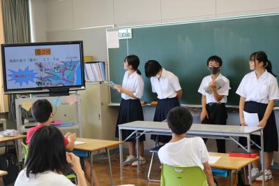 9月19日(火)三崎中3年生が,修学旅行で学んだことを、みさき小の6年生に伝える「防災学習会」を行いました。修学旅行で訪れた神戸市の「人と防災未来センター」で学んだことをもとに、クイズをつくって紹介したり、学校の避難路の整備として非常階段を掃除した経験を話したりしました。一緒に新聞紙で災害時に使えるスリッパをつくったりもしました。小学生は、みんな真剣にメモをとりながら聞いてくれました。今日の学習を今後の災害対策にも生かしていけるといいですね。