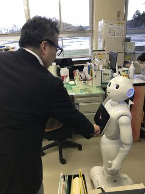 11月28日(火)、三崎中学校にペッパー君が来ました。ペッパー君は、ソフトバンク社で開発した人型ロボットで、人に話しかけたり、ダンスを踊ったり、クイズなど、環境学習や防災学習、情報学習などでも使えます。また、プログラミングの学習にもつかうことができます。今回は、ソフトバンクの担当の方に使い方を教えていただきました。12月いっぱいのレンタル期間の中で、生徒ともに、よりよい使い方を考えていきたいと思います。