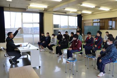 2月8日(木)、震災学校支援チーム・アースの河野先生からのお話を聞きました。10分という短い時間でしたが、河野先生自身が阪神・淡路大震災で被災した時のお話をもとに、三崎中のみなさんは、よくがんばっている、この震災での経験を忘れないでほしいと話してくださいました。そして、自分は、3年生が作成中のピザ窯が完成した時に、ここ珠洲にもどってきて、ピザ窯を見たいと言っていただきました。河野先生のお話で、パワーをいただきました。本当にありがとうございました。