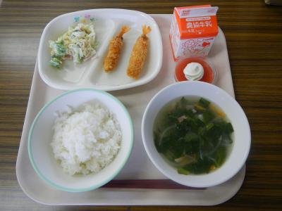 ごはん、牛乳、エビフライ、野菜とハムのサラダ、コンソメスープ
