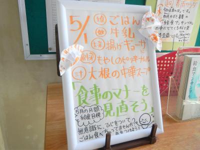 今月の月間目標は「食事のマナーを見直そう」です。今月から、階段の踊り場に毎日食言うメモを紹介します。