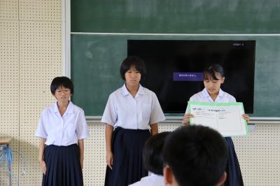 9月21日(木)後期生徒会役員選挙及び立会演説会がありました。後期生徒会に立候補した3名が、それぞれ、マニュフェストを基に、演説を行いました。会長立候補者のマニュフェストは「学校のルールを見直します。」、副会長立候補者は「目安箱の設置で、みんなが過ごしやすい学校を目指します」、委員立候補者は「少人数の良さを生かせる学校を目指します」と自分の思いをしっかりと演説で伝えることができました。その後、投開票が行われ、3名全員が信任投票により当選しました。おめでとうございます。マニュフェストを実現できるように、後期もぜひ、がんばってほしいと思います。