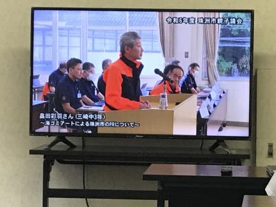 7月31日(水)珠洲市産業センターで親子議会が開催されました。三崎中からは畠田さんが、代表として発表と質問を行いました。海ゴミアートのワークショップを開き、いろいろな方に参加していただき、作成した作品を珠洲の魅力発信や復興に役立てていたきたいという提案でした。自身が作成した魚のアート作品を提示しながら、しっかりと発表できました。市長さんからも励ましの言葉があり、今後の活動に向けて力をいただきました。