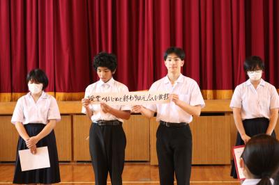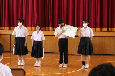 6月13日(火)、第3回の生徒集会を行いました。今回の生徒集会は、話し方や伝え方を意識した発表が印象的でした。国語の授業では、話し方や聞き方の学習があります。そこで学んだ、声の大きさ、スピード、間などを意識して、発表ができていました。また、質問も提案を交えながらの質問があったり、質問に対して、活動の意義や必要性にまで踏み込んだ返答があったりするなど、集会での対話にも進歩が見られました。