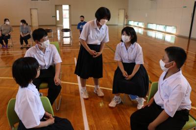 6月22日(木)、生徒集会で三中ナビゲーションを行いました。三中ナビゲーションは生徒会の目標に合わせ各委員会が企画し、学校全体で交流活動を行います。今回は、生徒会執行部が全学年のコミュニケーションを図るために、ジェスチャーゲームを企画してくれました。問題は、仕事、スポーツ、動物から出されました。簡単なようで、ジェスチャーで伝えるのは、なかなか難しく、最後の答えを発表すると、全然違った答えになっていて、驚きや笑いが起こりました。自分たちで考えた活動が全学年のコミュニケーションづくりに役立っていることを実感できた瞬間でもありました。