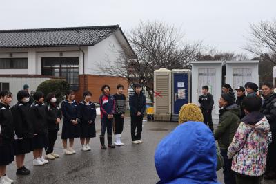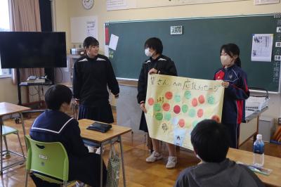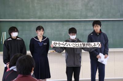 1月22日(月)、地震が起きてから3週間が経過し、4週目に入りました。この間、三崎中学校の体育館には、避難所が開設され、多くの方が避難していらっしゃいます。1月11日に学校を再開してからも、生徒の教育活動に、ご理解をいただき、水やトイレ等の多くのご支援をいただいています。その感謝も含めて、生徒が一人一人の思いや気持ちを綴ったメッセージを避難所の皆さんに贈りました。避難所のみなさんからは、あたたかい拍手やしっかり勉強して、社会に貢献できる人になってほしいという励ましの言葉をいただきました。ありがとうございました。