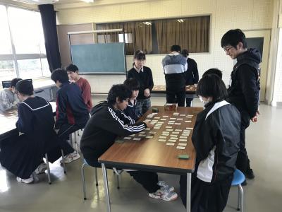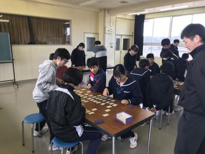 1月31日(水)、百人一首大会を行いました。全校を6グループに分けて、グループ対抗で試合を行いました。先生が上の句を読み上げると、集中して札を取っていました。集中した中でも笑顔や笑い声が出ていて、いつも活気のある様子が戻ってきたようでした。また、オンラインで参加している生徒には、クイズやゲームで参加してもらいました。とてもよいひと時でした。