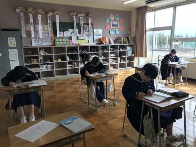 2月13日(月)、今日から3年生は、期末テストが始まりました。いよいよ中学校生活の学習の総まとめのテストとなります。避難生活の中、十分な学習環境が整っていない生徒も多いですが、みんながんばってテストに取り組んでいました。困難な環境に負けずに、学習した力を充分に発揮してほしいと思います。3年生、ファイト!