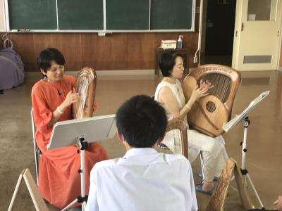 6月25日(火)、北陸3県竪琴バンドLIRA BANDIAさんの演奏会がありました。今回演奏していただいたメンバーはアキさんとシホさんのお二人です。使っている楽器は、ジブリ作品の「千と千尋の神隠し」主題歌を歌った木村弓さんが弾いていた楽器で、ライアー(竪琴)という楽器です。曲を聞きながら自然と音に引き込まれ、心が静かに、穏やかになっていくように感じました。アキさん、シホさん、ありがとうございました。