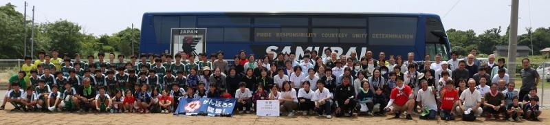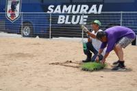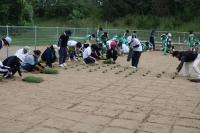 7月5日(土)、三崎中学校の仮設グラウンドに、日本サッカー協会様のご支援による「震災復興プロジェクト」の一環として芝生の苗植えがありました。県内はもとより、このプロジェクトに協賛いただいた企業各社の方々、地元の皆様、生徒と保護者の皆様などなど、総勢約150人にご参加いただき、苗の植え付けイベントを行うことができました。ありがとうございました。