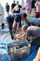 7月26日(土)三崎地区社会福祉協議会の皆様が主催した「みさきまち復興地引網体験会」に参加しました。当日は天気も良く穏やかな海で、小中学生、地域の方々、100人以上が集まり、網を引っ張りました。ぴょんぴょん跳ねる魚に歓声をあげながら、網を引っ張ること約1時間。大漁の魚が!!!