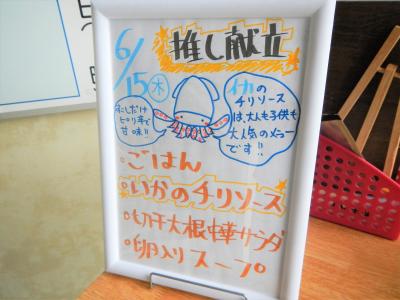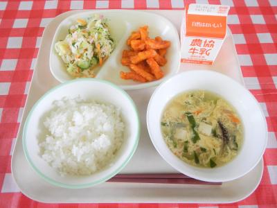 2023/6/15☆推し献立☆ごはん、牛乳、いかのチリソース、切干大根中華サラダ、卵入りスープ