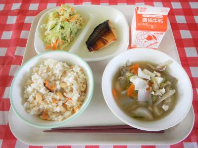 2023/6/16 干し椎茸炊込みご飯、牛乳、魚の塩こうじ焼き、たくあん和え物、山形芋煮風