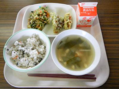 6/22 梅わかめご飯、牛乳、ちくわの磯部揚げ、おかか和え、大根の味噌汁