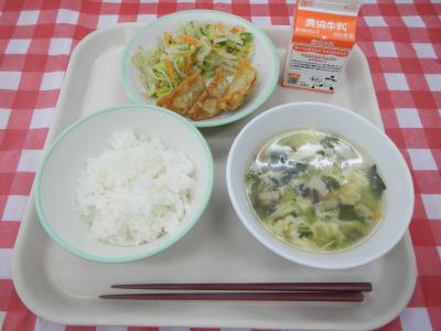 2023/11/27 ご飯、牛乳、揚げ餃子、ナムル、卵スープ