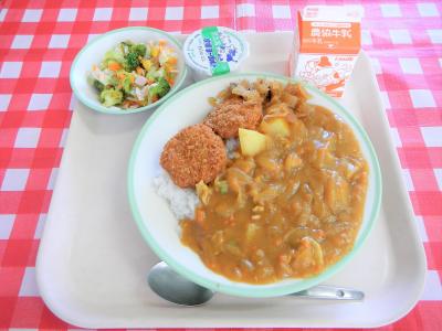 6/23 カツカレー、牛乳、コールスローサラダ、福神漬け、牧場ヨーグルト