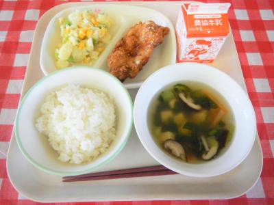 2023/6/20 ごはん、牛乳、フライドチキン風、チーズコーンポテト、きのこのスープ