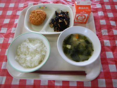 2024/9/12 ご飯、牛乳、コロッケ、ひじきの炒め煮、わかめのみそ汁