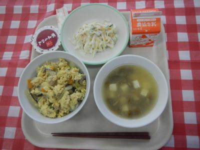 2023/6/30 親子丼、牛乳、いかくんサラダ、なめこのみそ汁、水ようかん