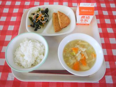 7/3 ごはん、牛乳、さつま揚げの生姜煮、もやしの和え物、白菜のみそ汁