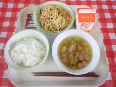7/3 ごはん、牛乳、和風スパゲティ、ウィンナーと大豆のスープ、ふりかけ