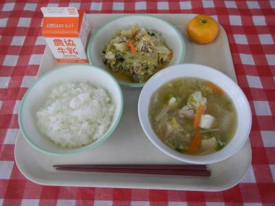 2024/11/13 ごはん、牛乳、肉団子、青菜いしる炒め、かきたまスープ