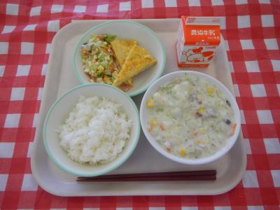 11/11 チーズの日 ごはん、スパニッシュオムレツ、野菜とチーズのサラダ、根菜クリームスープ