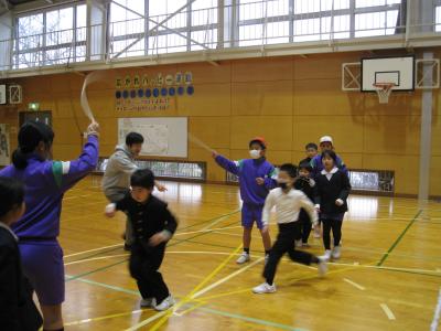 1・2年生の劇は「ももから生まれた6年生」で、6年生4人と鬼役の1・2年生がなわとびやリレーで対決する場面で盛り上がりました。替え歌のプレゼントもありました。