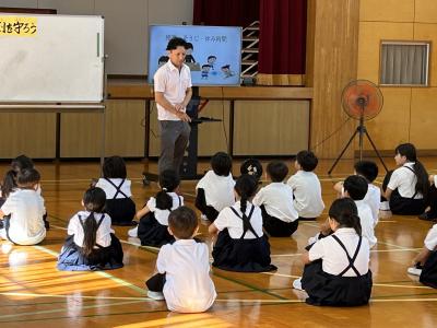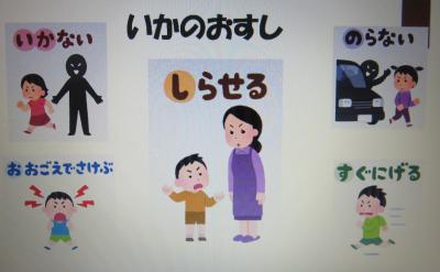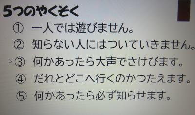 また、夏休みに向けて、「自分の命は自分で守ること!」についてのお話も学校側からしました。「5つの約束について」話をし、普段から、地域の方々がみんなのことを見守ってくれていることへの感謝の気持ちをもって、大きな声であいさつをして、地域の方々かどうかわかるようになっていてほしいという話をしました。