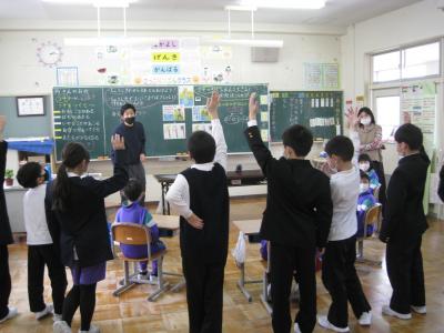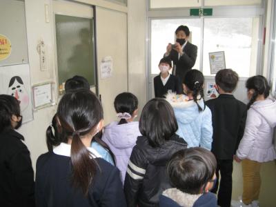 1・2年生が玄関でお出迎えし、教室へ案内しました。