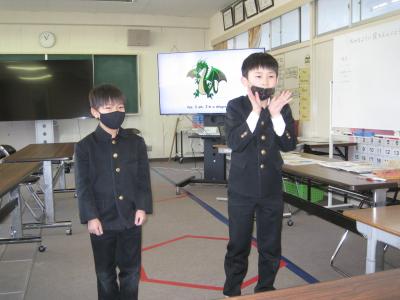 動物がかくれんぼする物語で、「Are you a monkey?」のように尋ね、「Yes,I am.」とやり取りを発表してくれました。