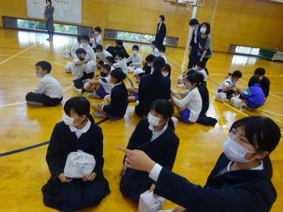 最後に体育館で、お菓子の入った袋をもらい、みんな笑顔で帰っていきました。