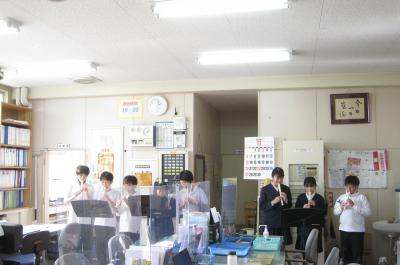 6年生が音楽の時間に、譜面台を持って職員室にやってきました。